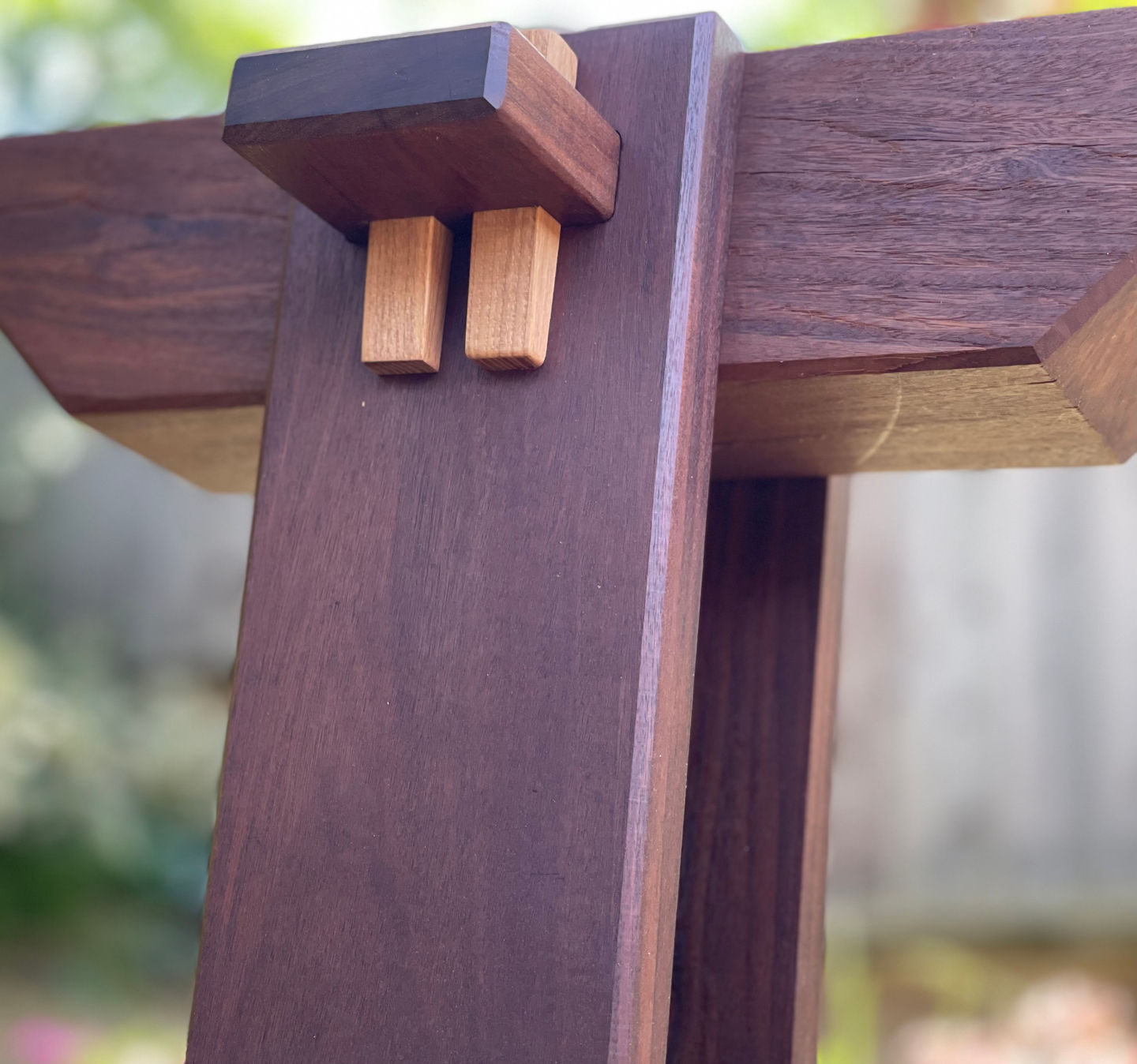 A meditative platform deck in solid Ipe, designed as a quiet transition between interior and garden. The integrated benches are supported by traditional Japanese joinery, with wedged through tenons and contrasting maple keys anchoring each support. Stone-filled channels beneath the benches offer drainage and grounding while echoing natural riverbeds. Built with reverence for grain, joinery, and rhythm, the piece invites stillness through structure and restraint.